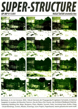 Super-Structure est une (super) structure d'édition Bruxelloise. Habitats précaires, cabanes, bunkers, des abris de toutes sortes peuplent les publications de SPR-STRCTR, visions prévoyantes pour les temps sombres et les apocalypses certainement à venir.
